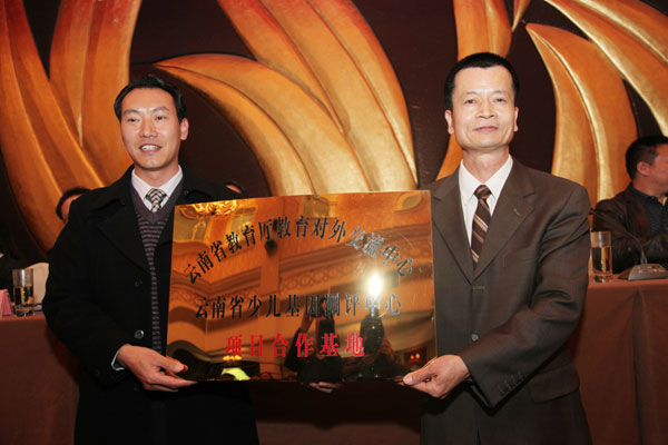 云南省教育廳外事處調(diào)研員、基因測評(píng)中心主任劉超(右)向安寧市好孩子教育培訓(xùn)學(xué)校校長魯植(左)授牌