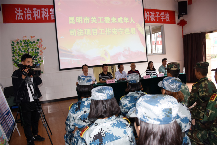 活動(dòng)開始,趙主任首先就未成年人司法項(xiàng)目工作在預(yù)防青少年犯罪和青少年觸法權(quán)益維護(hù)工作中的重要性,以及政府在開展未成年人司法保護(hù)工作中的努力和成效,向大會(huì)作了精彩致辭。隨后,趙主任還對(duì)孩子們作了殷切勉勵(lì):“這是我第四次來好孩子學(xué)校,雖然每一次來基本都是新面孔,但每一次來給我的印象都很深,很感動(dòng)。我曾是一名軍人,孩子們現(xiàn)在端正的坐姿、整齊的鼓掌以及良好的精神面貌,都讓我無比的自豪和欣慰,你們都是好孩子,出去也會(huì)是一個(gè)好兵。希望孩子們珍惜好人生的經(jīng)歷,珍惜好在好孩子的這段時(shí)光,努力提升自己,樹立遠(yuǎn)大目標(biāo),將來做一個(gè)德才兼?zhèn)涞娜。?br style="font-family: ;"> 隨后,趙主任一行在我校魯植校長(zhǎng)的陪同下,深入學(xué)校教學(xué)樓、宿舍樓等實(shí)地查看了校園環(huán)境,并在多媒體教室觀看了學(xué)校教學(xué)活動(dòng)短片。其間,魯校長(zhǎng)向趙主任詳細(xì)匯報(bào)了學(xué)校近期的各項(xiàng)教育教學(xué)工作開展情況。聽后,趙主任對(duì)我校的各項(xiàng)工作給予了高度肯定,尤其是夸贊學(xué)校法治宣傳教育開展得有聲有色,每年都有不一樣的新內(nèi)容呈現(xiàn)出來,無愧于“昆明市青少年法治教育基地”這個(gè)光榮稱號(hào)。