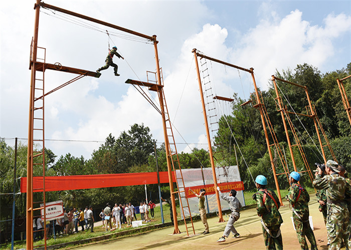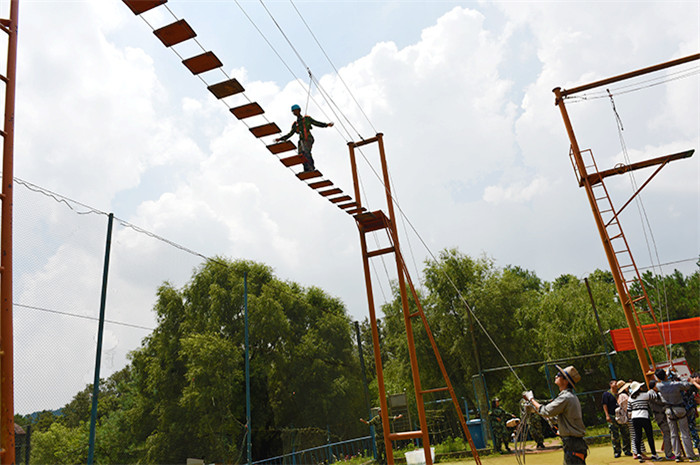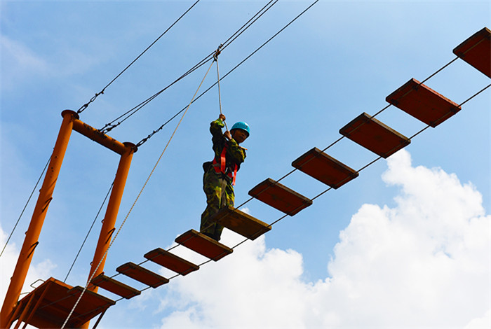 拓展活動(dòng)在教練們的耐心講解和簡(jiǎn)短的趣味游戲熱身中拉開了帷幕。隨后,同學(xué)們陸續(xù)挑戰(zhàn)了天梯、高空斷橋、探險(xiǎn)樂園等30余個(gè)項(xiàng)目。