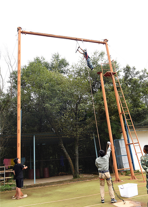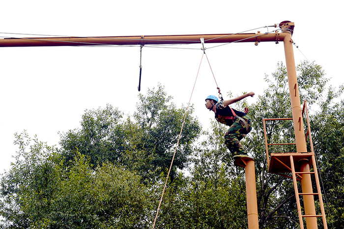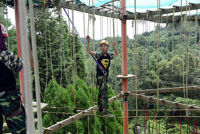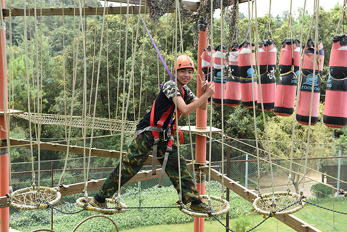 拓展活動在教練們的耐心講解和簡短的“戰(zhàn)前”熱身運動中拉開了帷幕。孩子們分成兩隊比拼,在各隊隊長的帶領(lǐng)下,分別組成了“紅軍隊”與“戰(zhàn)狼隊”,相應口號也立即產(chǎn)生,伴隨了各隊振奮人心、催人奮進的口號和加油聲,同學們陸續(xù)挑戰(zhàn)了巨人梯、空中抓杠、探險樂園等30余個項目。