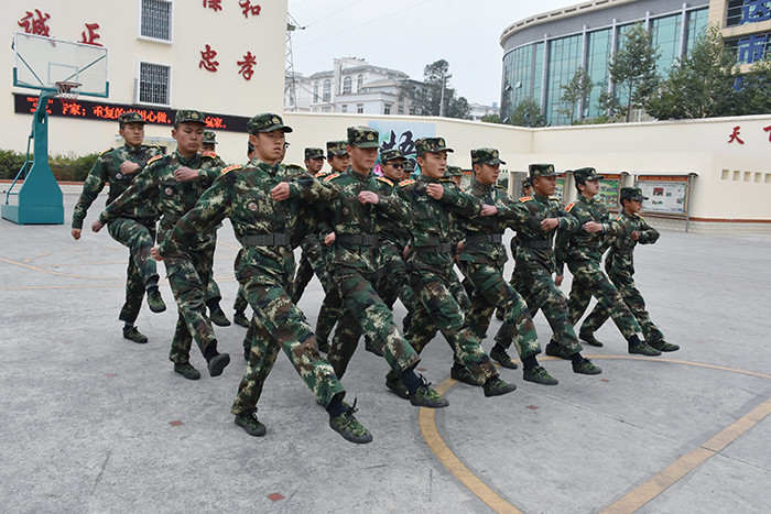 在基本的隊列表演完畢后, 伴著激揚的旋律,女生方隊進(jìn)行了《父親》手語操和女兵操表演。看!她們一個個精神抖擻,柔中帶剛,舉手投足釋放著青春的活力,贏得了師生陣陣熱烈的掌聲。伴隨著震耳欲聾的吶喊聲,男生方隊出場了!他們個個生龍活虎,一招一式,剛勁有力,為我們完整地展示了第二三套擒敵拳、基本手形步形、馬步?jīng)_拳。壓軸出場的教官摔擒表演、應(yīng)急棍術(shù)更是淋漓盡致地展現(xiàn)了當(dāng)代軍人的風(fēng)采。