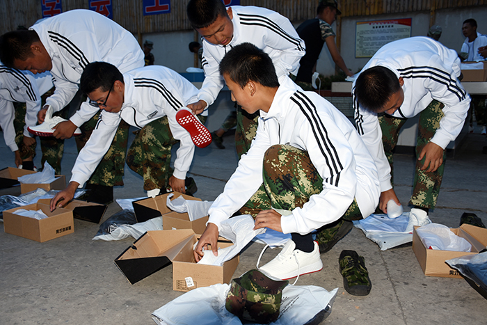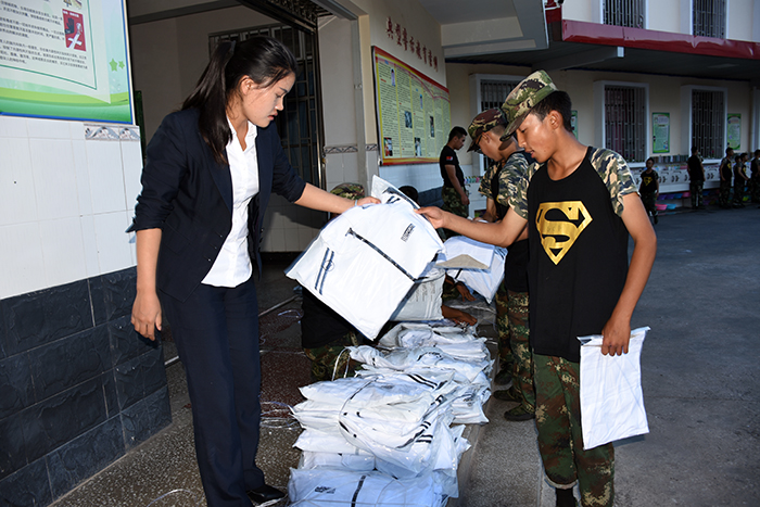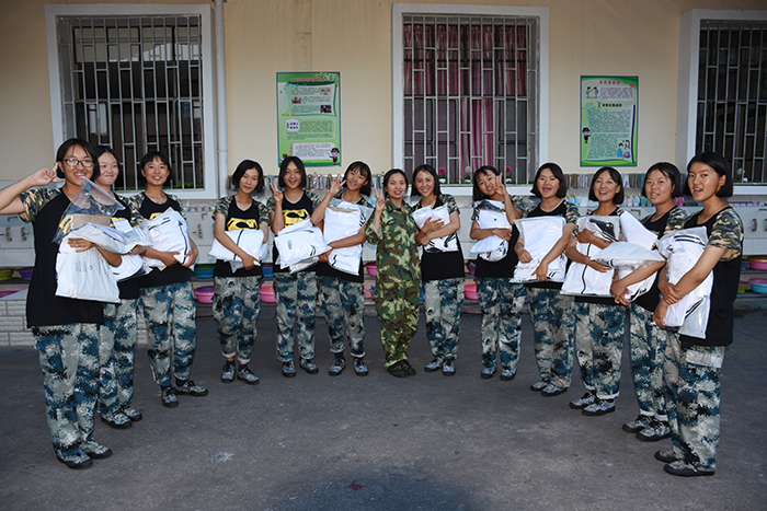 領(lǐng)到新裝的孩子非常興奮,不時(shí)說(shuō)著“真好看”、“好喜歡”、“好漂亮”、 “太幸福了”之類的話語(yǔ),并迫不及待地?fù)Q上漂亮的校服,站在鏡子面前,左照照、右照照,是那么合身、那么帥氣、那么有朝氣。你瞧,潔白的T恤和外套,配上黑色的褲子,加上白色運(yùn)動(dòng)鞋,既莊重又活潑,既樸素又大方。我校使用的迷彩服和運(yùn)動(dòng)服作為指定服裝,相得益彰,一個(gè)嚴(yán)肅,一個(gè)休閑,正好符合學(xué)校的“嚴(yán)管理,善對(duì)待”的教學(xué)理念,更體現(xiàn)了學(xué)校的人文關(guān)懷。