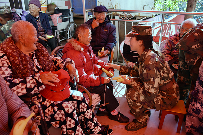 剛到敬老院,同學(xué)們就急忙把帶去的水果、日用品送到老人手中。在給老人分發(fā)水果時,同學(xué)們一聲聲“爺爺奶奶好!祝你們健康長壽!”的問候,讓老人們無比開心。不僅如此,孩子們還一邊噓寒問暖地跟老人聊天、拉家常,一邊當(dāng)起了“按摩師”......這些小小的舉動,讓老人眼里不時泛起了淚花,他們想起了自己的孩子、孫子,眼神里流露出的是高興,但也夾雜著悲傷!
