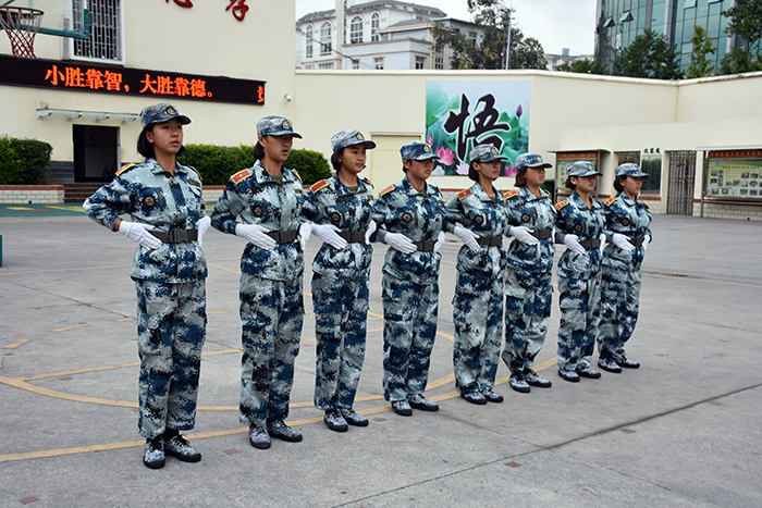 隨后,各方隊在教官的指揮下進行了分列式、應急棍、匕首操、擒敵拳、手語操、舞蹈等表演。同學們整齊的隊伍、精準的動作、昂揚的士氣、嘹亮的軍歌、優(yōu)美的旋律、燃燒的激情贏得了陣陣掌聲。