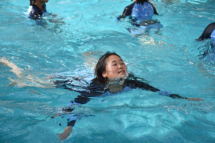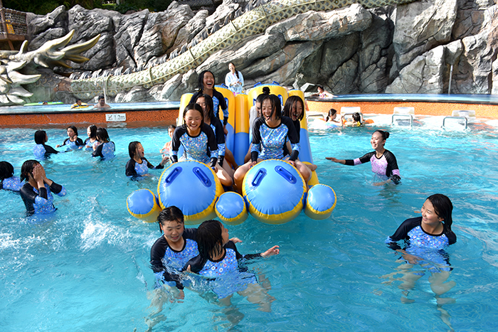 泳池中,同學(xué)們還不時(shí)搞下惡作劇,上一秒還在友好地討論著如何提高游泳技術(shù),下一秒就趁其不備,開(kāi)始了水中的潑水大戰(zhàn),好似在過(guò)潑水節(jié),也讓人情不自禁聯(lián)想到冬天打雪仗的情景。此刻,想象和現(xiàn)實(shí)沒(méi)有差距,在水中,無(wú)論男生還是女生,都玩得不亦樂(lè)乎。盡情玩耍后,會(huì)游泳的孩子還開(kāi)始了游泳比賽,其他孩子自動(dòng)分為兩列站在水中,為比賽的同學(xué)加油打氣。游泳池中,顏色明快統(tǒng)一的泳衣,清脆開(kāi)心的歡笑聲,成了溫泉中一道亮麗的風(fēng)景線。說(shuō)來(lái)也神奇,在這樣的氛圍中,之前怯水的同學(xué)不知不覺(jué)就克服了恐懼心理,也能在水中自如地走來(lái)走去。