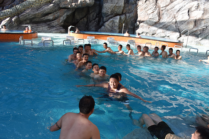 刺激項(xiàng)目體驗(yàn)結(jié)束后,孩子們成群結(jié)隊(duì)地到各種特色功能浴中一一享受。一入池中,大家便遙想起唐朝佳人楊貴妃溫湯美容的故事來(lái),更何況,溫泉中設(shè)有薄荷、牛奶、鮮花、檸檬等養(yǎng)顏潤(rùn)膚浴,這是對(duì)當(dāng)代人的恩寵,會(huì)令楊貴妃自嘆不如,去責(zé)怨唐玄宗白當(dāng)了一世皇帝,倒不如去做安寧的普通市民,可美美享受森林溫泉的美容浴。親親魚(yú)療池中,魚(yú)兒親密接觸腳掌的酥癢,讓孩子們不時(shí)咯咯地笑出聲來(lái),牛奶池、玫瑰池、中草藥池等等池中,更是留下了孩子們無(wú)數(shù)的歡聲笑語(yǔ)和吃著雪糕的無(wú)限滿足......有的池子本來(lái)容納不下太多人,但孩子們就是喜歡擠在一起,嬉戲調(diào)侃,不時(shí)擺拍留影,讓隔著屏幕看照片的人,都能感受到這個(gè)大家庭別樣的溫暖。