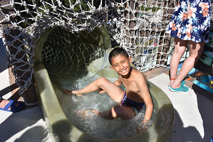 泳池中玩累了,孩子們稍作休息,便又元?dú)鉂M滿地開(kāi)始了各種驚險(xiǎn)刺激的水上項(xiàng)目挑戰(zhàn)。在湍急的出水口,在急速滑下而濺起的浪花中,孩子們開(kāi)懷大笑又有些驚險(xiǎn)的表情被記錄了一次又一次。同一個(gè)項(xiàng)目,一遍又一遍玩耍的熱情,一次又一次開(kāi)心的尖叫,讓我們感受到了孩子們火一樣的青春。