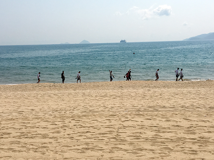 7日上午,孩子們又跑到海邊游泳,這或許是云南孩子特有的情愫。有的孩子穿著薄衣薄褲一步一步地邁入海中,眺望遠(yuǎn)方冉冉升起的太陽(yáng);有的又在海灘上狂熱地戲海逐浪;有的懶洋洋的躺在沙灘的躺椅上,瞇眼斜看著流金溢彩的沙灘,聽(tīng)潮起潮落,一點(diǎn)也不擔(dān)心會(huì)被曬黑,甚至還有種想把自己曬得一身古銅色的小愿望。