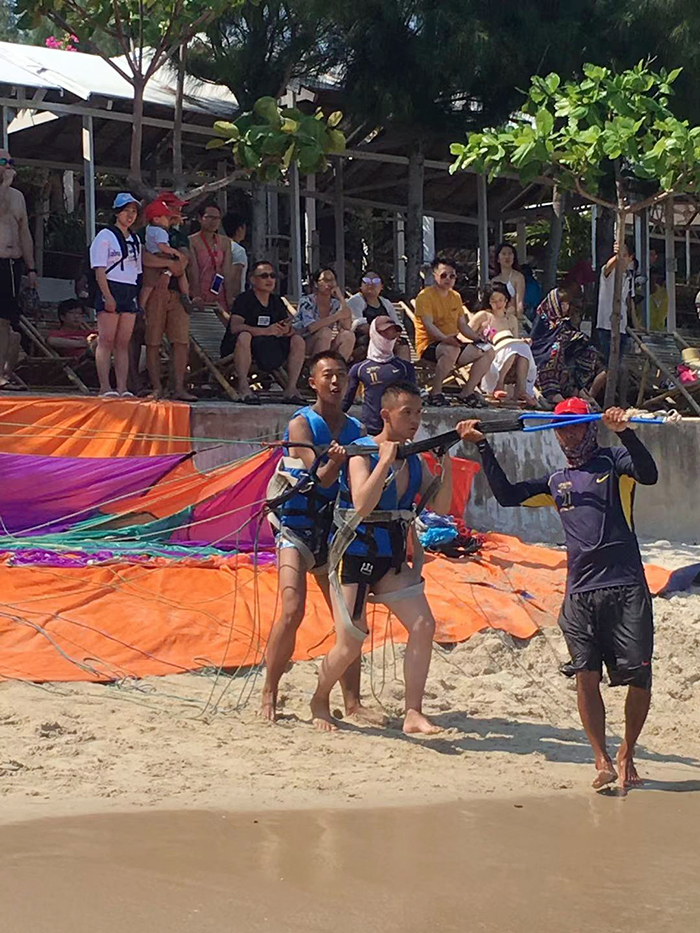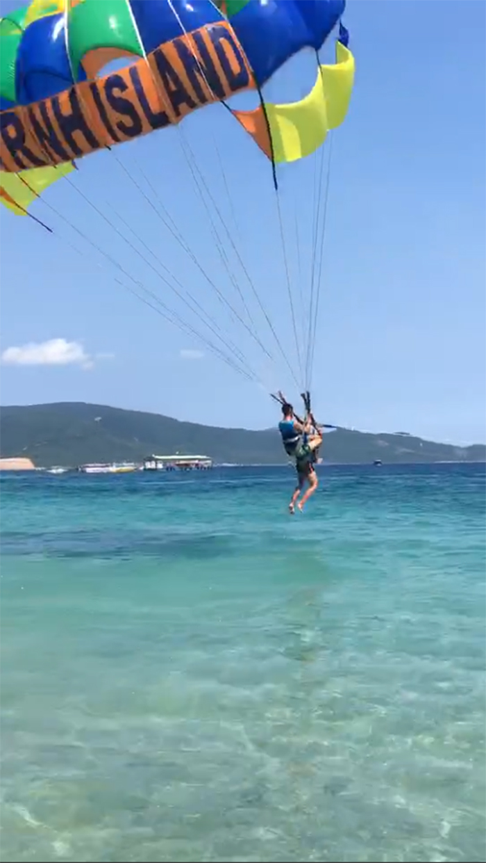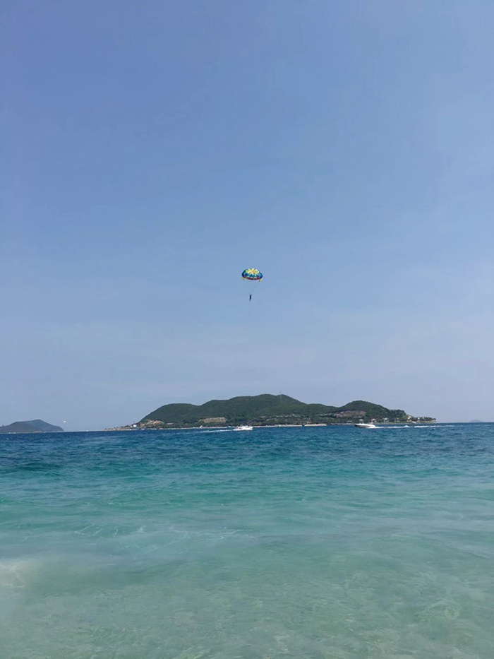 8日上午,孩子們興致勃勃地坐著木船出海到“竹島”游泳、曬太陽(yáng),并在船上享用美味的海鮮風(fēng)味餐,真是寧?kù)o時(shí)光的無(wú)盡享受。隨后又去“黑島”玩水上降落傘,陸續(xù)起飛的降落傘不斷從水上的高空飄過(guò),紅黃相間的大傘鼓滿了風(fēng)帆,在碧海藍(lán)天之間劃出了靚麗的弧線。俯瞰深藍(lán)的芽莊大海,像是鳥(niǎo)兒一般在自由自在的飛行。