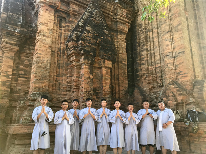 根據(jù)行程安排,孩子們9號到達目的地后,卸下航程的疲憊,美美睡了一覺,10日一大早品嘗了當?shù)氐拿朗澈螅闱巴鶇⒂^芽莊最重要的歷史遺跡——占婆塔。這座隱藏在芽莊的“小吳哥窟”,站在其頂部平臺眺望,芽莊碧藍的海港都盡收眼底。這里信奉師婆,受印度文化影響很深。印度教徒稱占婆女神是印度教希瓦神的化身,越南佛教徒稱她為天依女神,保護著靠海吃海的漁民,相當于中國漁民心目中的媽祖。不斷更疊的歷史,讓曾經(jīng)這座占婆人的神祗在各種文化親潤下發(fā)生著變化,今天的遺址上,既能看到歷史變化的痕跡,也能體味到越南人民宗教信仰的永恒。