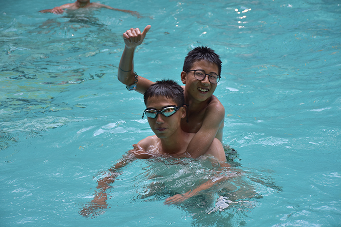 泳池中,同學們還不時搞下惡作劇,上一秒還在友好地討論著如何提高游泳技術,下一秒就趁其不備,開始了水中的潑水大戰(zhàn),好似在過潑水節(jié),也讓人情不自禁聯(lián)想到冬天打雪仗的情景。此刻,想象和現(xiàn)實沒有差距,在水中,無論男生還是女生,都玩得不亦樂乎。游泳池中,顏色明快統(tǒng)一的泳衣,清脆開心的歡笑聲,成了溫泉中一道亮麗的風景線。說來也神奇,在這樣的氛圍中,之前怯水的同學不知不覺就克服了恐懼心理,也能在水中自如地走來走去。