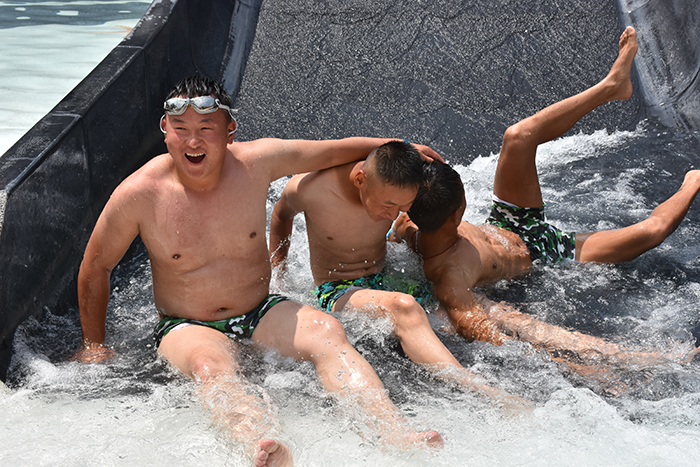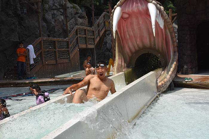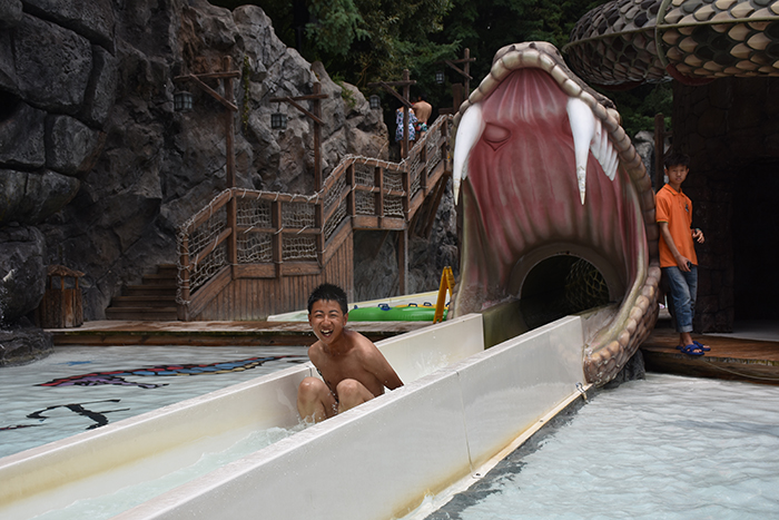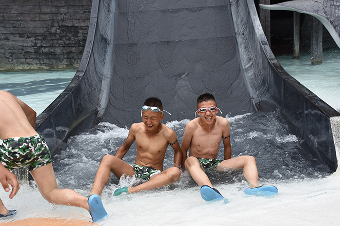 泳池中玩累了,孩子們稍作休息,便又元氣滿滿地開始了各種驚險刺激的水上項目挑戰(zhàn)。在湍急的出水口,在急速滑下而濺起的浪花中,孩子們開懷大笑又有些驚險的表情被記錄了一次又一次。同一個項目,一遍又一遍玩耍的熱情,一次又一次開心的尖叫,讓我們感受到了孩子們火一樣的青春。
