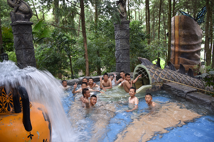刺激項目體驗結束后,差不多已是傍晚,孩子們成群結隊地到各種特色功能浴中一一享受。一入池中,大家便遙想起唐朝佳人楊貴妃溫湯美容的故事來,更何況,溫泉中設有薄荷、牛奶、鮮花、檸檬等養(yǎng)顏潤膚浴,這是對當代人的恩寵,會令楊貴妃自嘆不如,去責怨唐玄宗白當了一世皇帝,倒不如去做安寧的普通市民,可美美享受森林溫泉的美容浴。親親魚療池中,魚兒親密接觸腳掌的酥癢,讓孩子們不時咯咯地笑出聲來,牛奶池、玫瑰池、中草藥池等池中,更是留下了孩子們無數的歡聲笑語......有的池子本來容納不下太多人,但孩子們就是喜歡擠在一起,嬉戲調侃,不時擺拍留影,讓隔著屏幕看照片的人,都能感受到這個大家庭別樣的溫暖。