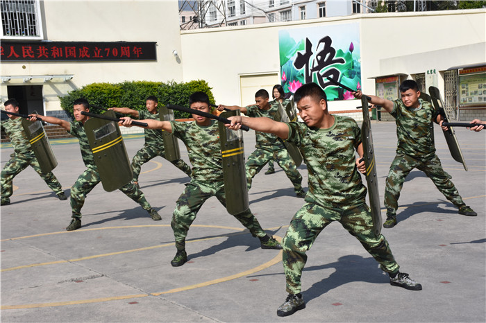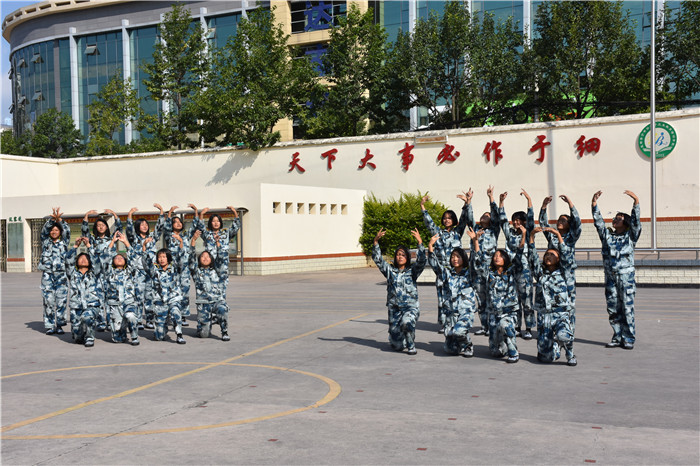 之后的《匕首操》一招一式,鏗鏘有力,干凈利落的動作,勢如破竹的氣勢,拳拳生風展雄姿,好不瀟灑。女兵操《平凡之路》特色表演,同學們也樣樣在行。陽剛堅毅的少年兒郎,英姿颯爽的鏗鏘玫瑰,剛?cè)岵嗟靡嬲,讓我們看到了孩子們在闊步前行中綻放出的最美的模樣。老師們也大展身手,表演的《盾牌操》舉手投足虎虎生風,盡顯豪氣方剛,精彩的表演贏得師生們熱烈的掌聲。