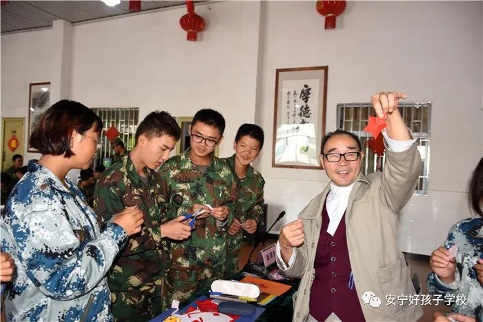結(jié)合活動主題,耿老從簡單的剪“紅五星”及“法”字著手,再增加難度到“!薄ⅰ皣帧、“蜻蜓”等圖案,不厭其煩地講解折紙、裁剪角度等要領(lǐng)。同學(xué)們上下翻折著手中的彩紙,時而低頭思索,時而拿起來認(rèn)真對照圖樣,神情十分專注。在耿老的精心指導(dǎo)下,同學(xué)們一折、一剪、一展,剪紙仿佛有魔法一般,一個個栩栩如生的作品便躍然眼前,在場的人無不發(fā)出聲聲驚嘆。耿老還現(xiàn)場把孩子們裁剪的作品塑封好,分發(fā)給他們。孩子們拿著自己的“杰作”,紛紛拍照留念,舉在頭頂?shù)摹胺ā弊,也成了此次活動的點(diǎn)睛之筆。