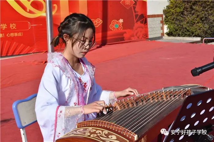 二班獨奏的古箏《芒種》,盡顯悠揚婉轉,在動人的旋律中,我們既看到了孩子扎實的演奏技巧,也更直接、生動地感受到了她“彈情非彈琴”的意境和古箏的藝術魅力。同時也讓我們感受到了農民伯伯的艱辛和歡愉,一幅忙碌的耕種圖躍然眼前。而在舞臺的另一側,孩子們卻用日常所學,專心致志地現(xiàn)場書寫春聯(lián),琴聲結束,書寫也相繼完畢,配合十分默契。