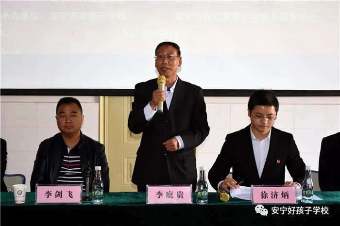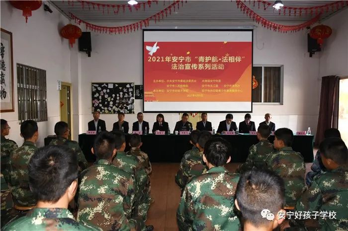 為加強(qiáng)青少年法治教育和思想道德教育,預(yù)防和減少未成年人違法犯罪,提高未成年人自我保護(hù)能力,推進(jìn)依法治市,建設(shè)平安安寧, 2021年4月9日上午, 由市委政法委、共青團(tuán)安寧市委、市人民檢察院、市關(guān)工委、市未司辦主辦,安寧市向日葵青少年事務(wù)服務(wù)中心、安寧好孩子學(xué)校承辦的“青護(hù)航•法相伴”法治宣傳系列活動(dòng)在我校多功能室舉行。市委政法委副書記李劍飛、市人民檢察院第四檢察部主任孫曉宇、市關(guān)工委專職副主任李庭貴、團(tuán)市委副書記徐濟(jì)炳、市人民檢察院和市關(guān)工委部分“五老”成員等領(lǐng)導(dǎo)出席了本次活動(dòng);顒(dòng)由團(tuán)市委副書記徐濟(jì)炳主持。