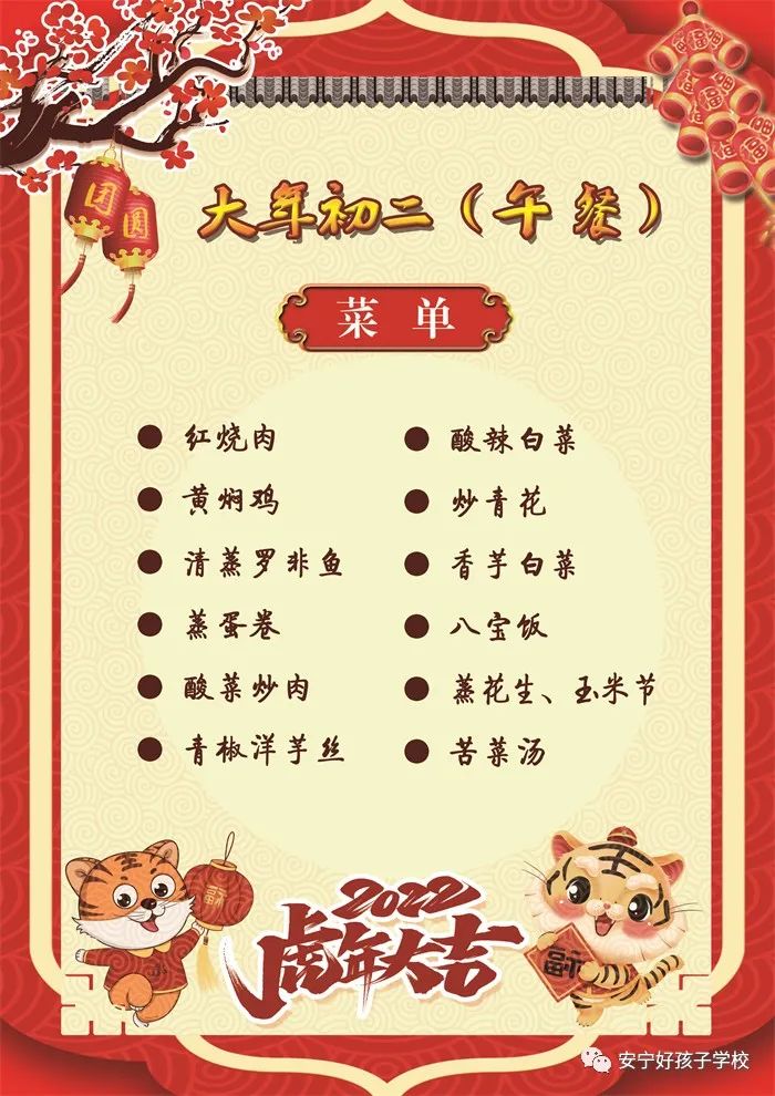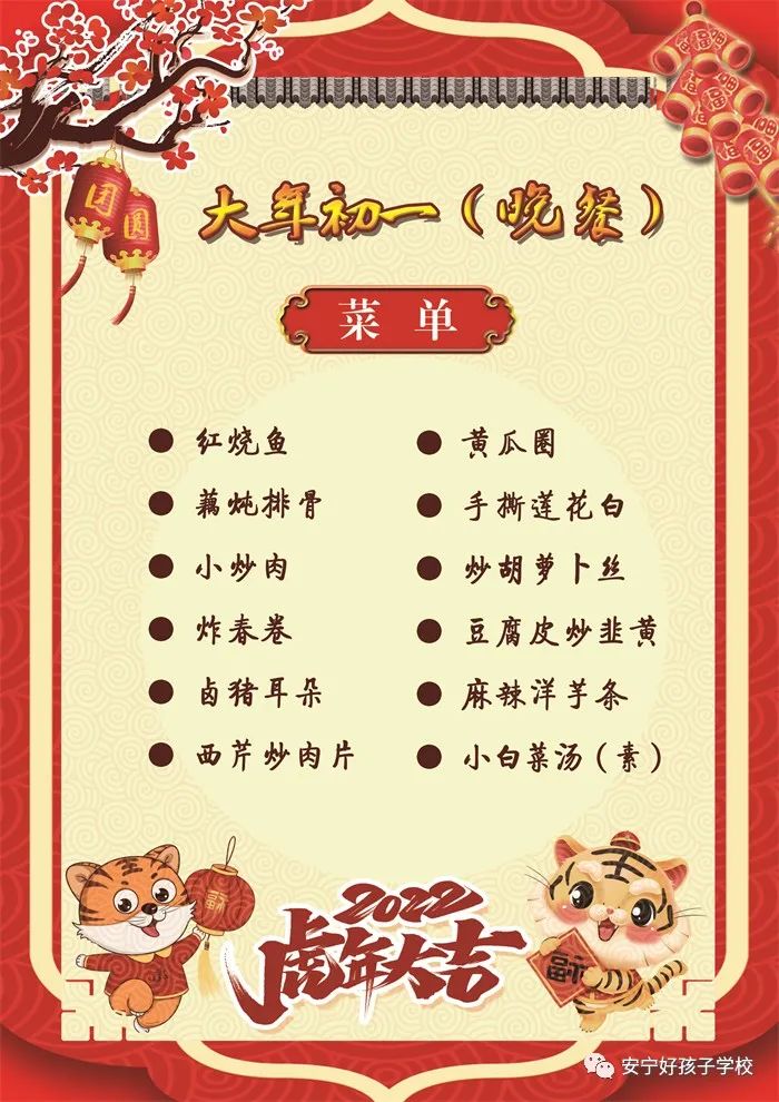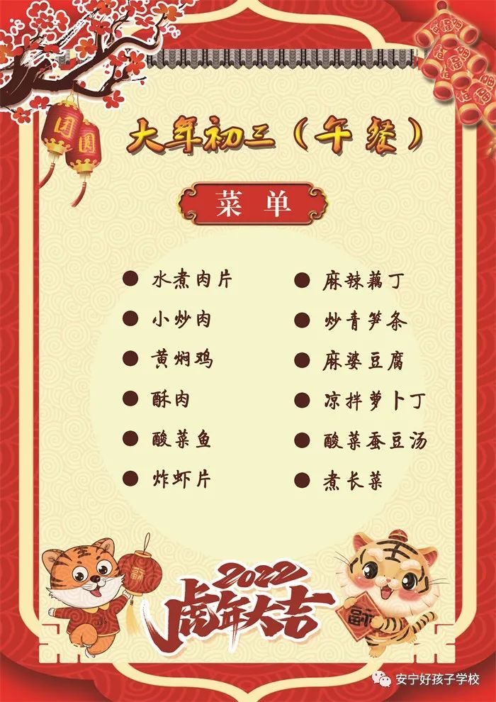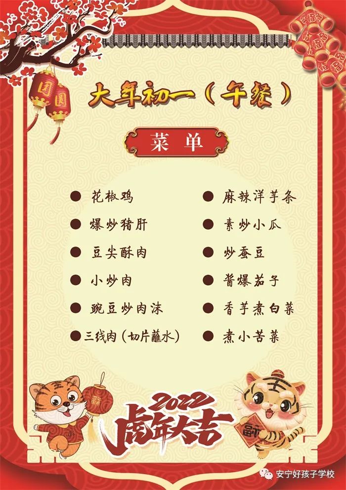 過年了 !孩子們吃什么?這是學校領導幾天來一直思考的問題。經(jīng)過與學校營養(yǎng)師、食堂廚師們多次商議后,本著營養(yǎng)、健康、不浪費,又要保證孩子每餐都能吃上新鮮可口的飯菜,終于議定了菜單,現(xiàn)予以公布。祝孩子們新年快樂!祝全體家長萬事如意!