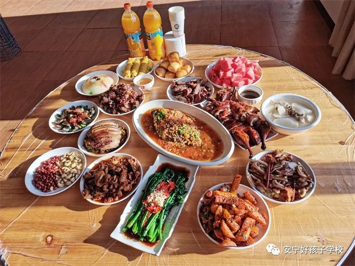 經(jīng)過一天的忙碌,傍晚,孩子們幫著學(xué)校廚師們?yōu)閹熒臏?zhǔn)備的美食端上餐桌。