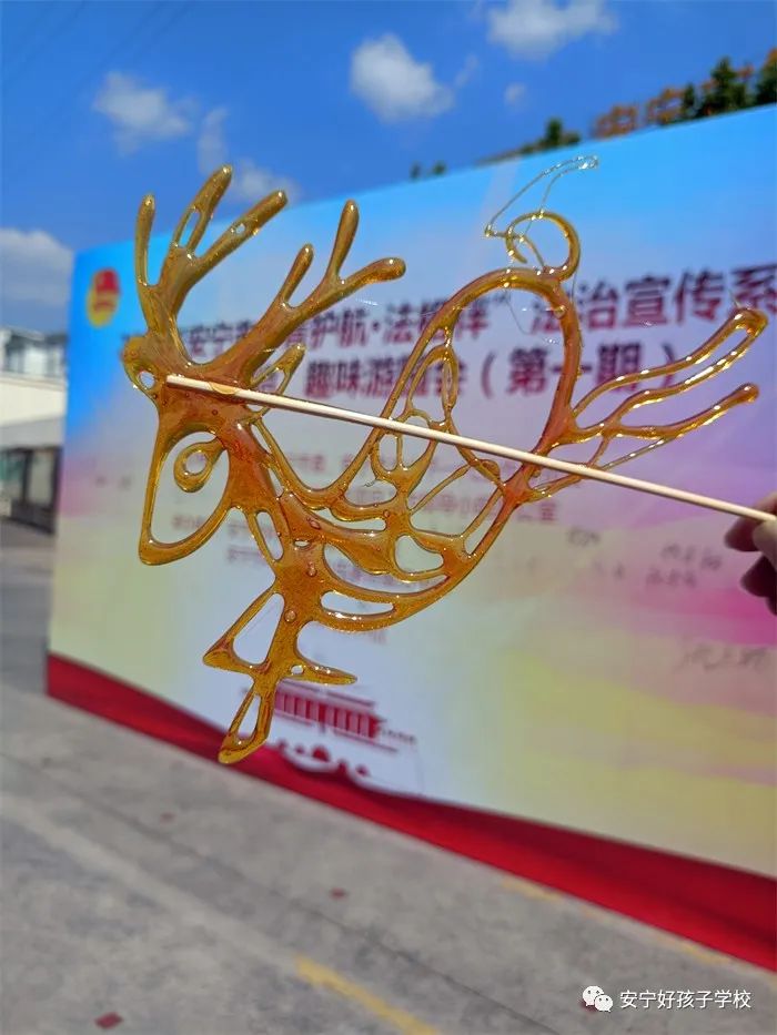 在每個游戲中,同學們都努力集齊“青護航,法相伴”六個字,完成游戲打卡的同學,歡天喜地的到禮品兌換點兌換甜蜜糖畫,一時間,兌換點的糖人泥人供不應求。大家一邊吃著糖人,一邊在簽名墻上留下自己的名字!疤钱嬏鹪诖介g,知識記在心里”!吨腥A人民共和國預防未成年人犯罪法》、《中華人民共和國未成年人保護法》等相關法律法規(guī)貫穿游戲始終,同學們在玩中學,在學中樂,無形中強化了同學們的法律意識,增強了法治觀念。