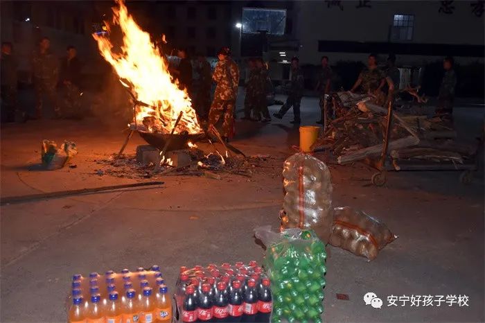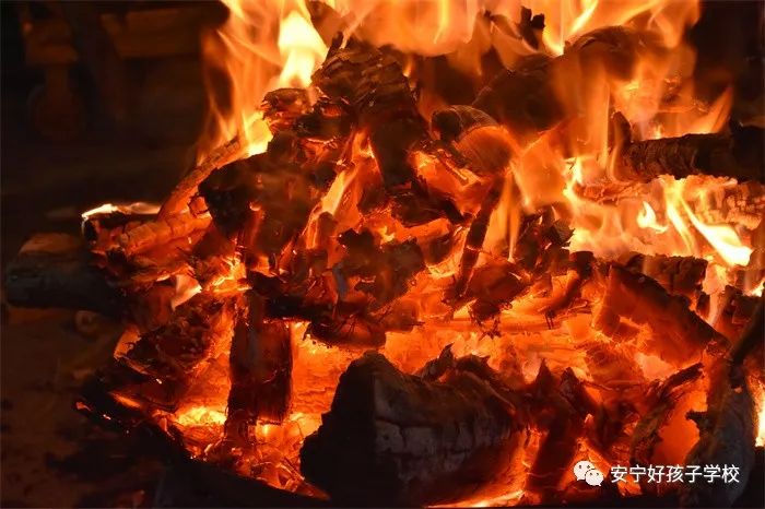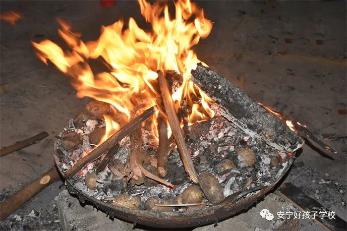 晚上七點,大家期待已久的篝火晚會正式拉開帷幕。在極具民族特色的“納西三部曲”、“左腳舞”、“三跺腳”等音樂聲中,師生們圍著熊熊燃燒的篝火歡快地唱著、跳著,載歌載舞。即使沒有舞蹈功底,也可以樂在其中,老師喊停的時候還嗨得忘我,沉醉在這歡樂的海洋中,想必也沒有什么比這個更燃的了。孩子們玩累了,就開啟了云南人特有的模式——燒洋芋。喝著飲料,吃著香噴噴的洋芋,別提有多開心了。