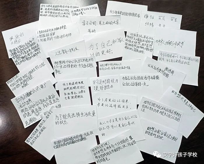 課程伊始,張老師首先通過“你為什么學習?”這一簡單提問,單刀直入、切入主題,孩子們?nèi)粲兴,爭相發(fā)言。隨后張老師又和孩子們進行互動,要求孩子們在收到的小紙片上以匿名的方式寫下自己的想法。孩子們在紙片上暢所欲言,有的回答簡單直白,有的充滿童趣,有的誠懇務實。張老師挑選了部分答案進行分享,課堂氛圍活躍了起來,孩子們熱情高漲。