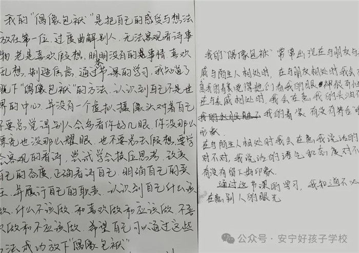 最后,在“我的偶像包袱”課程作業(yè)中也體現(xiàn)出了孩子們的收獲。有的孩子為自己以前總要求父母、朋友圍著自己轉(zhuǎn),把他們的好當(dāng)做理所當(dāng)然而感到后悔,表示以后會(huì)盡量學(xué)著“己所不欲,勿施于人”;有的孩子想起自己以前太過(guò)在意別人的看法與議論,非常在意形象,浪費(fèi)了很多的時(shí)間,現(xiàn)在會(huì)嘗試著把更多的精力和時(shí)間放在自己該做的事情上;還有的孩子發(fā)現(xiàn)自己總會(huì)把自己的缺點(diǎn)和別人的優(yōu)點(diǎn)做對(duì)比,把自己放在了很低的位置,而通過(guò)本節(jié)課的學(xué)習(xí),發(fā)現(xiàn)了自己也有很多優(yōu)點(diǎn),對(duì)自己的認(rèn)識(shí)更進(jìn)一步。