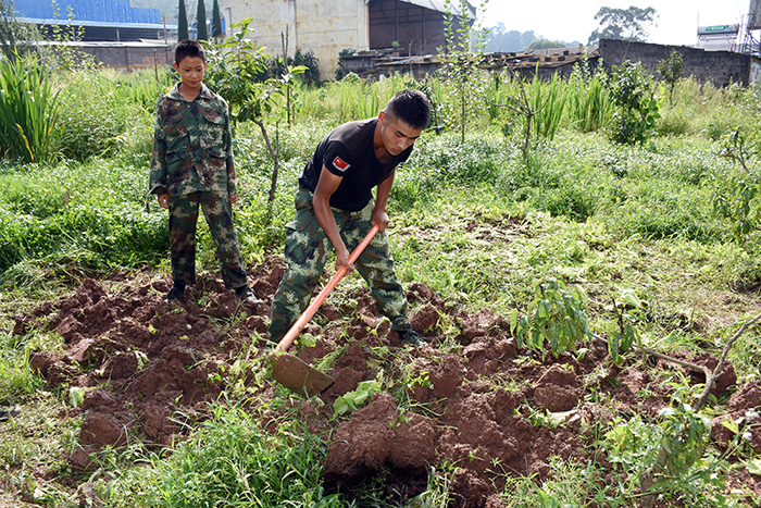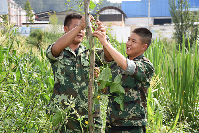 有的孩子在玉米地里調(diào)皮地吹著喇叭花,像是吹著沖鋒號(hào),等待隊(duì)伍的集結(jié)。有的靜靜聆聽(tīng)溝渠里青蛙的重奏,還不忘臨摹幾聲。有的看見(jiàn)蝸牛,好奇地放在手里仔細(xì)端詳。有的和老師一起,為瓜藤找一個(gè)延伸之地。有的掄起鋤頭挖地,種上下一季的希望。