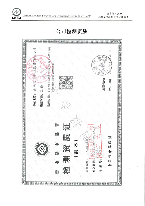 2019年6月26日,為有效預防和遏制雷電災害事故的發(fā)生,我校特委托云南雷寶科技服務有限公司對我校的辦公樓、教學樓、食堂等各建(構(gòu))筑物、供配電系統(tǒng)、設備設施及各裝置安裝的防雷設施進行全面檢測,以及對“防直擊雷裝置”、“防閃電感應裝置”、“電涌保護”、“等電位連接”等防雷裝置進行安全評估,共對24個防雷測試點進行了接地性能參數(shù)檢測。經(jīng)檢查,各項指標均符合國家現(xiàn)行防雷規(guī)范的要求與指標,并向我校出具了書面檢測報告。